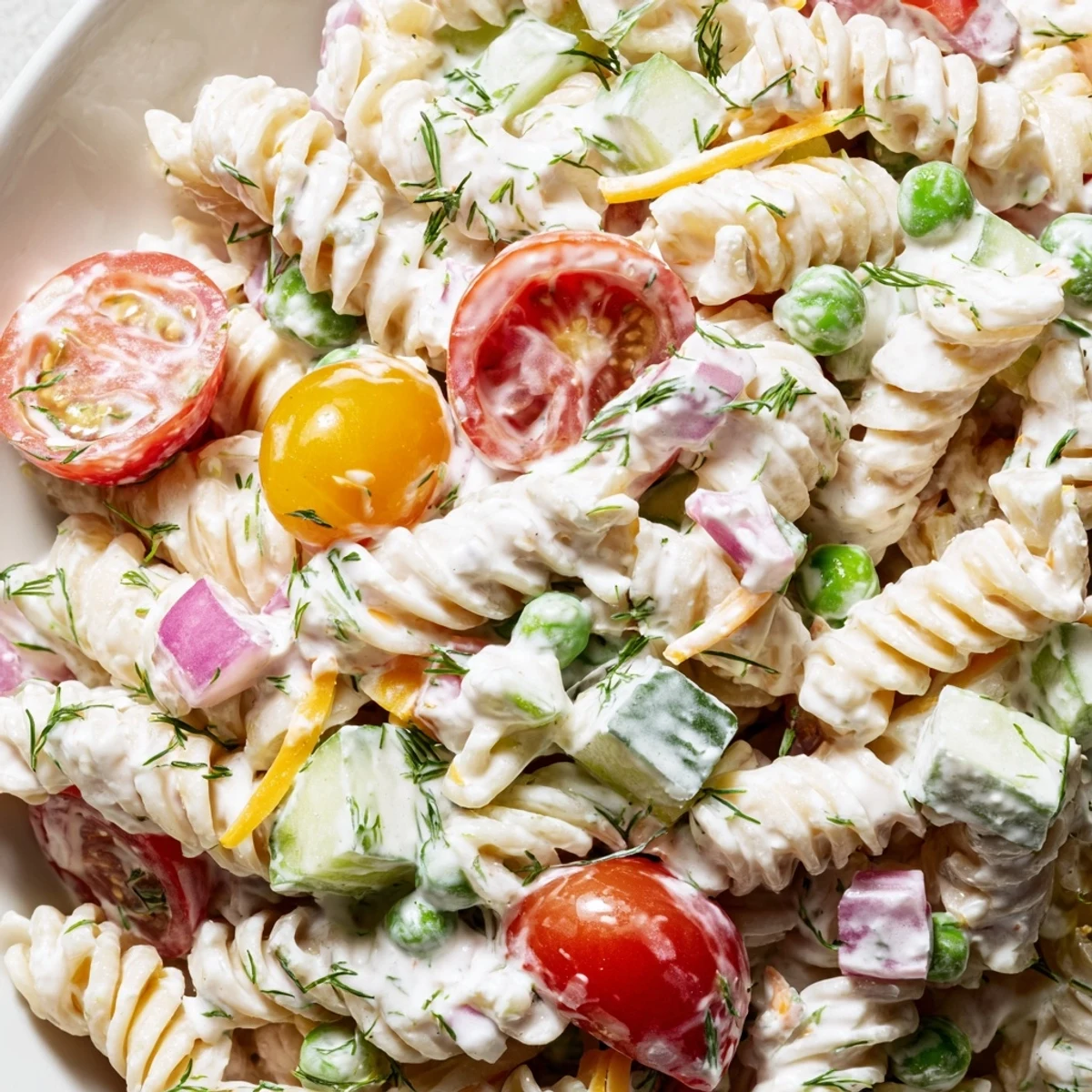 This vibrant pasta salad combines tender rotini with crisp cherry tomatoes, cucumber, bell pepper, and sweet peas in a tangy homemade ranch dressing. The creamy blend of mayonnaise, sour cream, and buttermilk creates a rich coating that clings perfectly to every bite. Fresh dill and chives add brightness while garlic and onion powder provide savory depth. Chill for an hour to let flavors meld, then serve alongside grilled meats or bring to your next potluck. Optional cheddar and bacon make it hearty enough to stand alone as a light lunch.