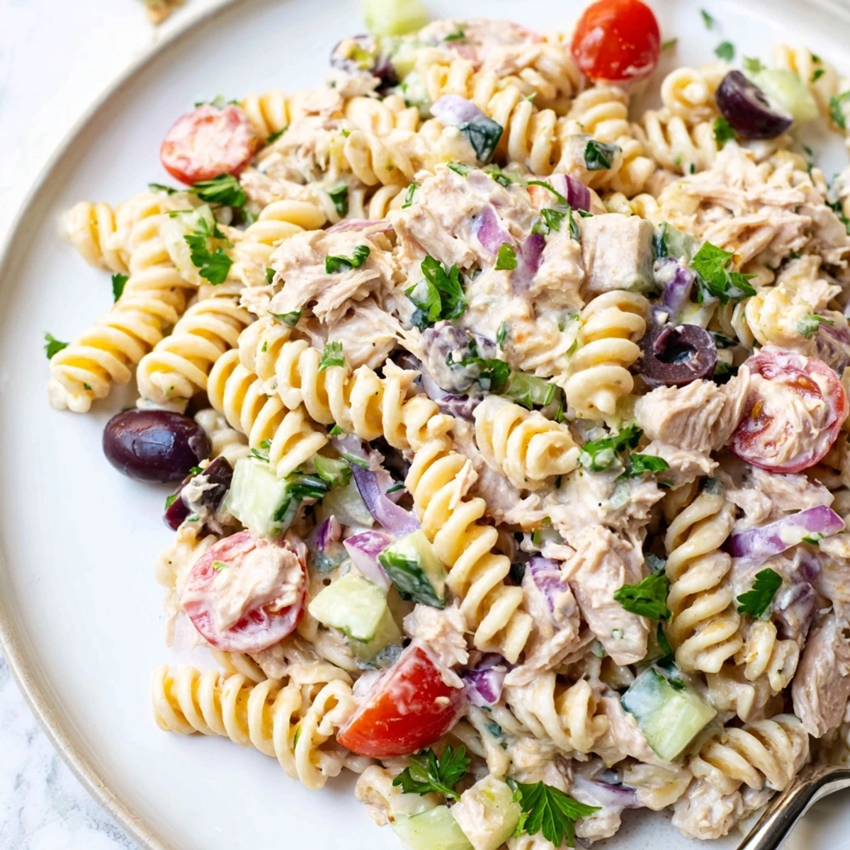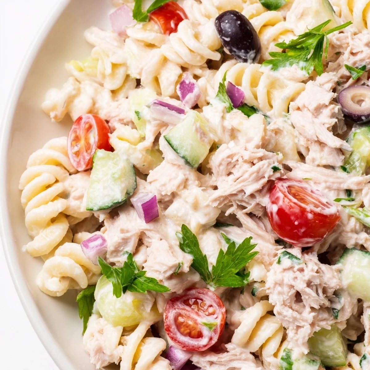 This cold pasta dish combines al dente noodles with protein-rich tuna and crisp vegetables like cherry tomatoes, cucumber, celery, and red onion. The creamy dressing blends mayonnaise with Greek yogurt, Dijon mustard, and fresh lemon juice for tangy flavor. Chill for 30 minutes before serving to let flavors meld. Perfect for potlucks, picnics, or make-ahead lunches.
